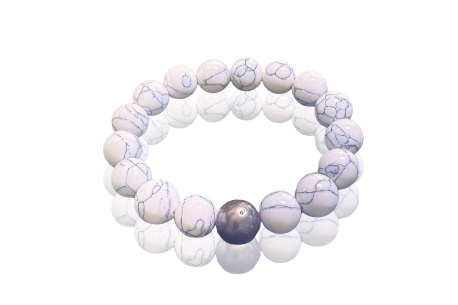 The Dynasty bracelet combines elegant white torque stones with lustrous black freshwater pearls, crafted on a high-end elastic silicone cord for a sleek slip-on fit.